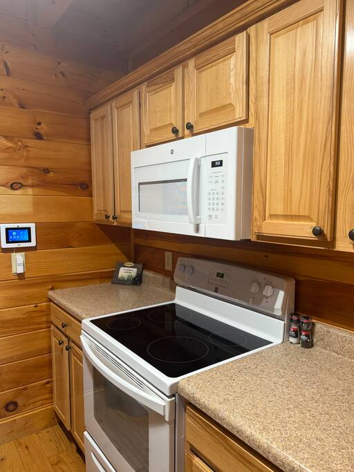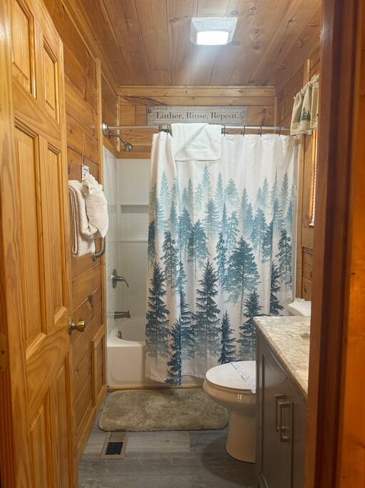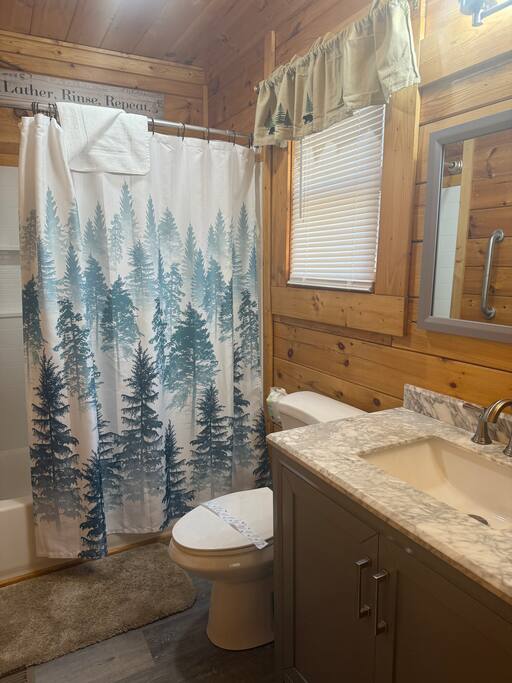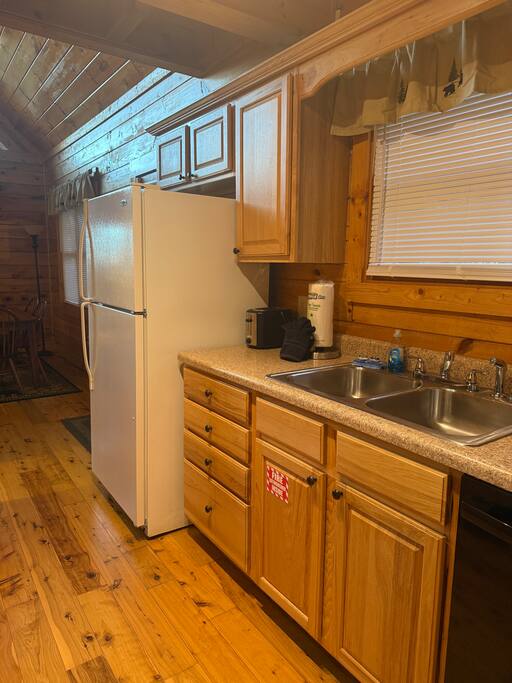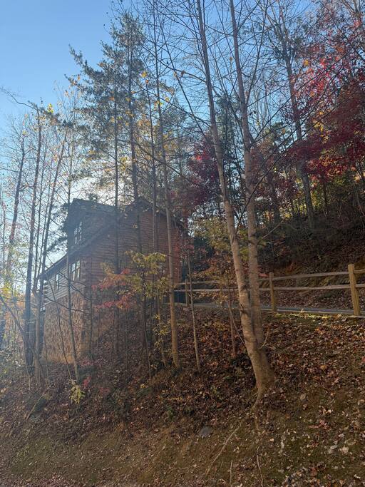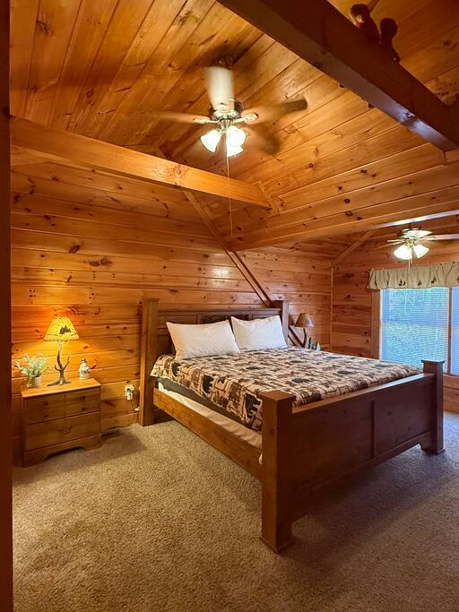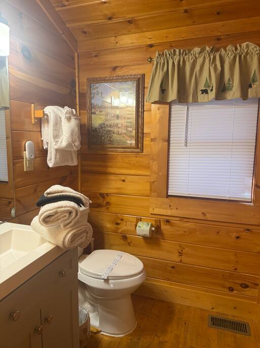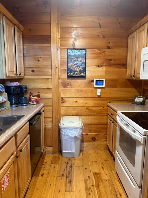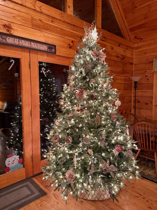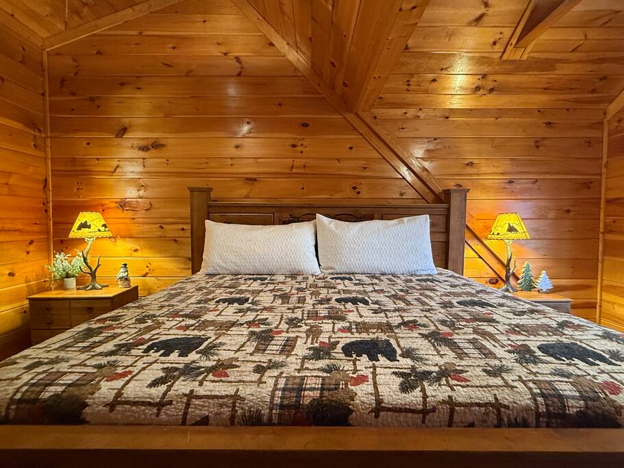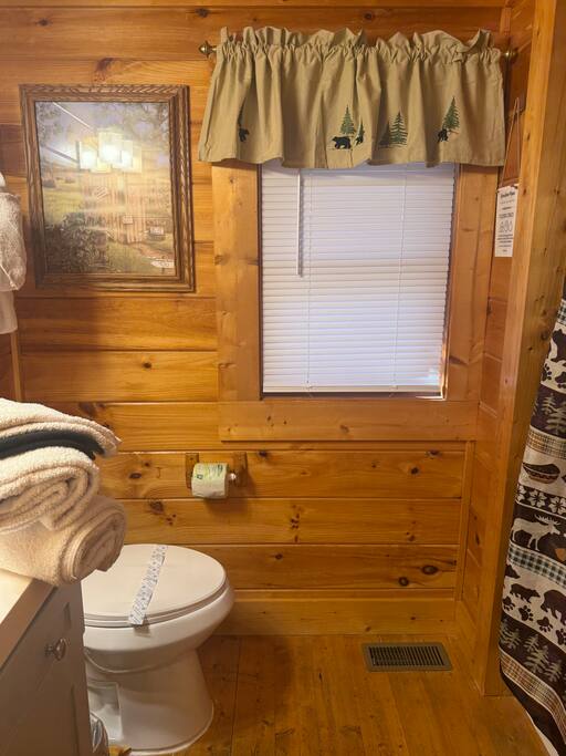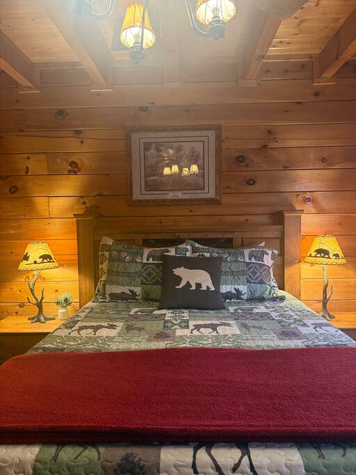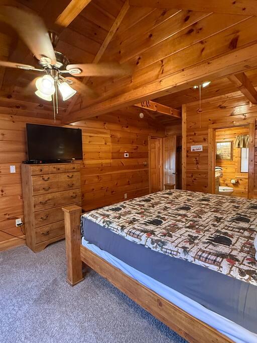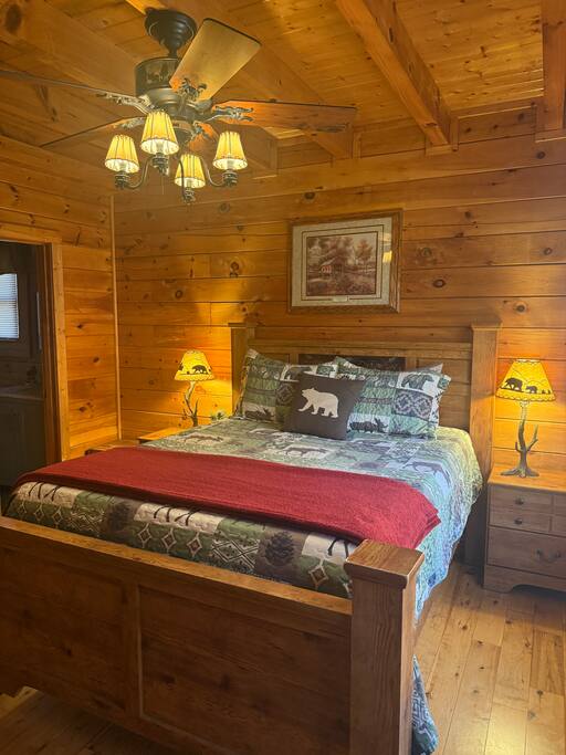 *We will be decorated for the Christmas holiday season during the first week of November, adding a festive touch to your stay!* ** CABIN HIGHLIGHTS ** • Free parking on-site • One master king suite • One master queen suite • 2 rocking chairs on the balcony overlooking Tennessee's native trees with seasonal mountain views in the winter • Hot tub • 60-inch smart TV with cable in the living room • 42-inch flat screen TVs in both bedrooms with cable • Electric fireplace in the living room • Dining table for 6 • Cable and fast Wi-Fi • Sleeper sofa in the living room • Fully stocked kitchen • Contactless self-check in with smart lock • Charcoal grill ** BLACK BEAR FALLS RESORT ** Our home is located in the sought-after Black Bear Falls Resort. This is Gatlinburg’s premier log home resort community. Nestled in over 43 acres of towering native trees, beautiful ridges, and natural springs and streams. The community is conveniently located within a short drive to nearby downtown Gatlinburg, Pigeon Forge, Dollywood, and the Great Smoky Mountains National Park. *Enjoy free access to the seasonally available outdoor community pool from May-September* FREE STARTER KIT: • Bed linens and towels • Toilet paper (2 rolls) • Paper towels (1 roll) • Hand soap • Dishwasher detergent tablets (2) • Trash bags (2 kitchen bags, 2 per bathroom, one bear proof trash bag) • Coffee and K-cups • Basic spices (salt and pepper) ENTRY LEVEL QUEEN MASTER SUITE • Queen-sized bed • Full en suite with tub/shower combo • Flat screen TV with cable • Closet with hangers, fan, heater, iron, and extra pillows and bedding for sleeper sofa. • Ceiling fan • Travel crib with original mattress: provide your own bedding (sheets/blankets) • High chair • Two baby gates SECOND FLOOR KING MASTER SUITE • King-sized bed • Full en suite bathroom with shower • Flat screen TV with cable • Closet with hangers, ironing board, with extra blankets • Ceiling fan LIVING ROOM/KITCHEN & DINING AREA • Cathedral ceilings • Dining table with seating for 6 • Cozy leather sleeper sofa (full-sized, linens provided) • Smart TV with cable & streaming services *please bring your logins* • Electric fireplace • Fully stocked kitchen (dishes, glasses, utensils) • Coffee maker and Keurig machine • Toaster, handheld mixer, blender, water kettle, pots/pans • Full sized fridge with freezer • Above-stove microwave • Dishwasher • Washer/dryer combo OUTDOOR SPACES • Surrounded by Tennessee's native trees • Hot tub • 2 rocking chairs • Bistro table for 2 • Charcoal grill *bring your own charcoal* *The community pool is available the last week of May until the first week of September. The pool is less than 5 minutes from the cabin with parking spaces in front of the pool area* **BOARD GAMES** • Jenga • Monopoly • Bananagrams • Uno • Trivial Pursuit • Connect 4