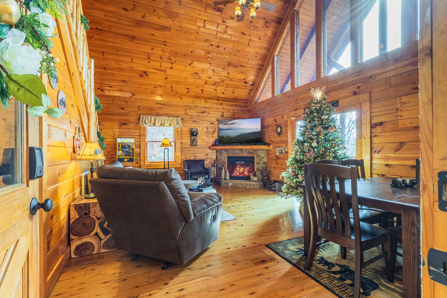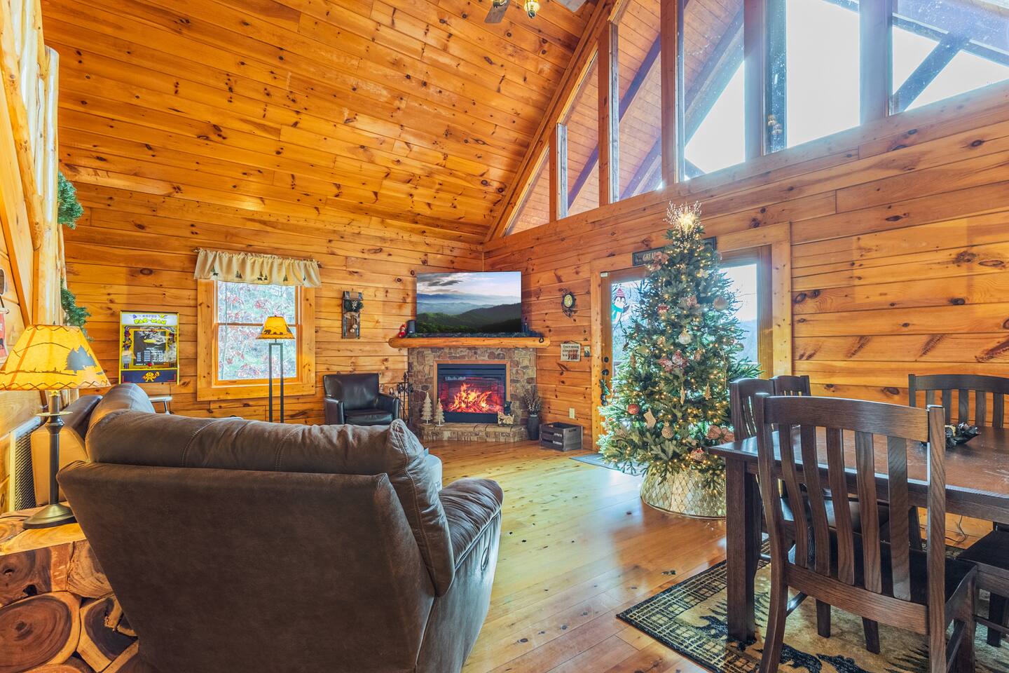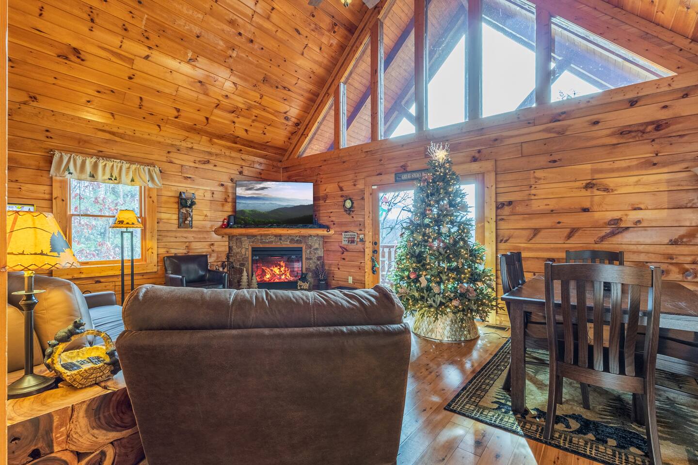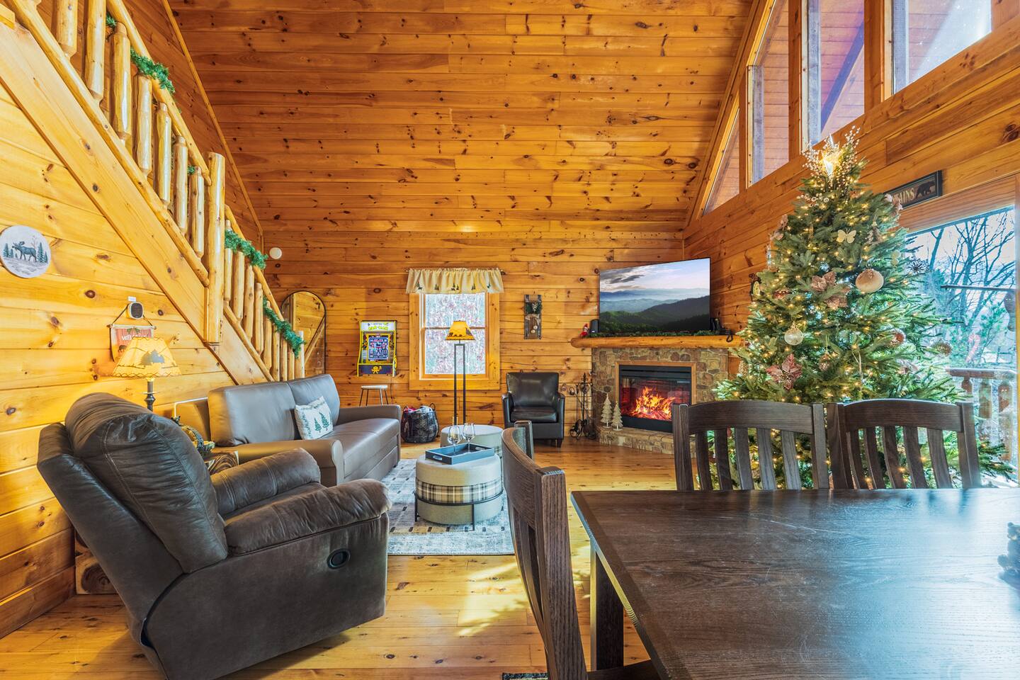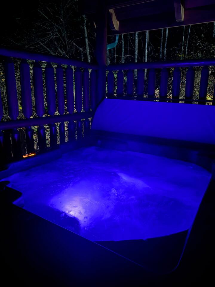 *We will be decorated for the Christmas holiday season during the first week of November to mid-January, adding a festive touch to your stay!* ** CABIN HIGHLIGHTS ** • King en suite • Queen en suite • 2 rocking chairs on the covered balcony surrounded by Tennessee's native trees with a mountain view • Hot tub • 60-inch smart TV with cable in the living room • Sleeper queen sofa • Electric fireplace • Cable and fast Wi-Fi • 42-inch flat screen TVs in both bedrooms with cable • Fully stocked kitchen • Dining table for 6 • Contactless self-check in with smart lock • Free parking on driveway • Seasonally available outdoor community pool typically open from Memorial Day to Labor Day • Charcoal grill • Conveniently located within a short drive to nearby downtown Gatlinburg, Pigeon Forge, Dollywood, and the Great Smoky Mountains National Park FREE STARTER KIT: • Coffee k-cups & pre-filled coffee filters, creamer, & sugar provided • Paper towels • Toilet paper • Shampoo/conditioner • Hand soap • Dish soap • Dishwasher pods • Laundry detergent • Trash bags QUEEN EN SUITE - ENTRY LEVEL • Queen-sized bed • Full private bathroom with tub/shower combo • Flat screen TV with cable • Closet with hangers, fan, heater, iron, and extra pillows • Ceiling fan • A travel crib with original mattress (stored under the bed in the downstairs bedroom). Please bring your own bedding and sheets if you choose to use travel crib • High chair (stored in closet in downstairs bedroom). KING EN SUITE - SECOND FLOOR • King-sized bed • Full private bathroom with shower • Flat screen TV with cable • Closet with hangers, ironing board, with extra blankets • Ceiling fan LIVING ROOM/KITCHEN & DINING AREA • Cathedral ceilings • Dining table with seating for 6 • Cozy leather sleeper sofa (queen-sized, linens provided) • Smart TV with cable & streaming services –– please bring your logins • Electric fireplace • Fully stocked kitchen (dishes, glasses, utensils) • Duo Keurig coffee machine • Toaster, handheld mixer, blender, water kettle, pots/pans • Full sized fridge with freezer • Above-stove microwave • Dishwasher • Washer/dryer combo OUTDOOR SPACES • Covered balcony • Surrounded by trees with a mountain view • Hot tub • 2 rocking chairs • Bistro table for 2 • Charcoal grill –– bring your own charcoal Black Bear Falls Resort offers access to a community pool seasonally with a pool pass, typically open from Memorial Day to Labor Day, depending on the weather and resort management's discretion. The pool is just a short drive away, with parking available in front of the pool area. **BOARD GAMES** • Jenga • Monopoly • Bananagrams • Uno • Trivial Pursuit • Connect 4