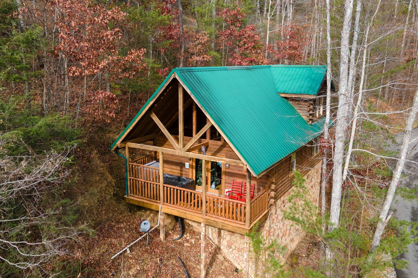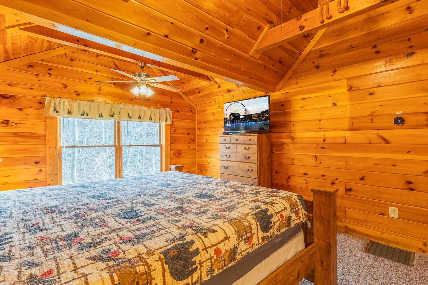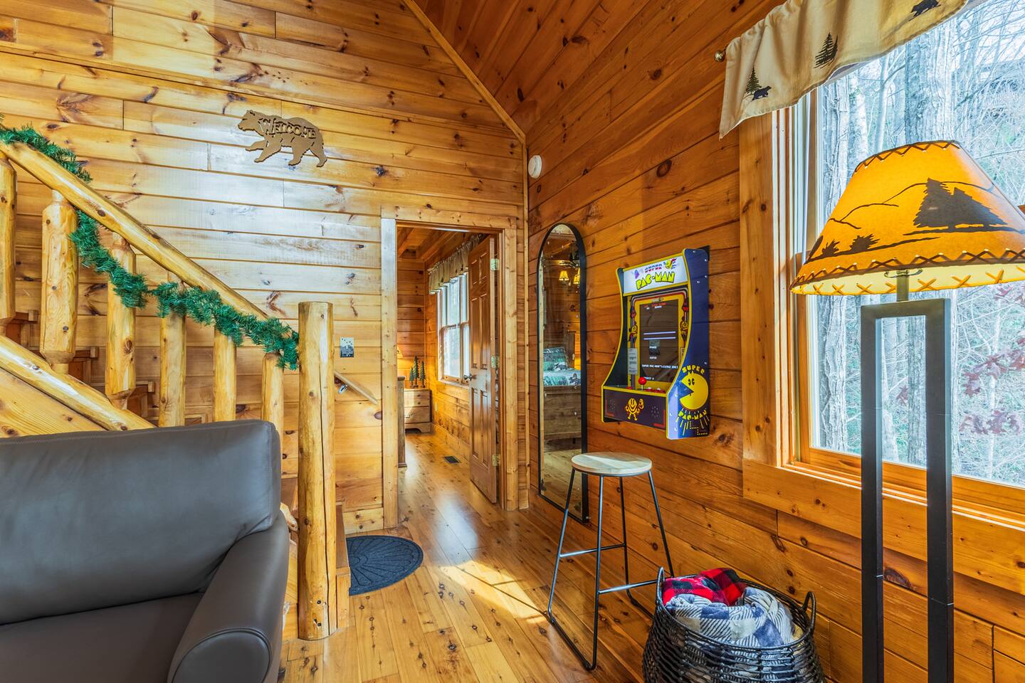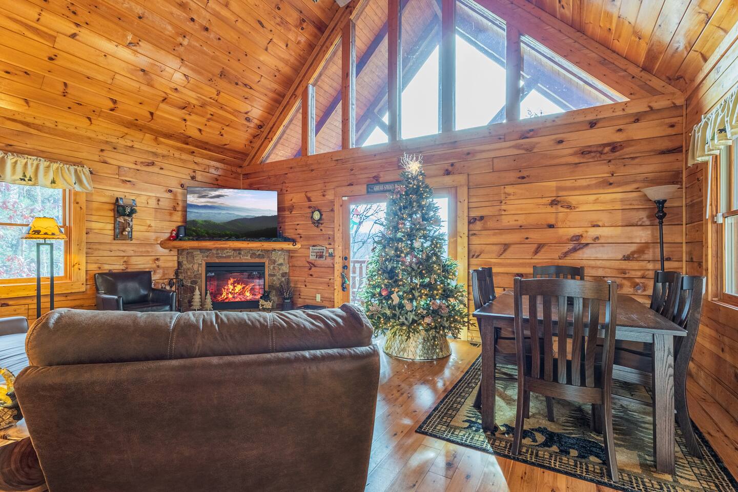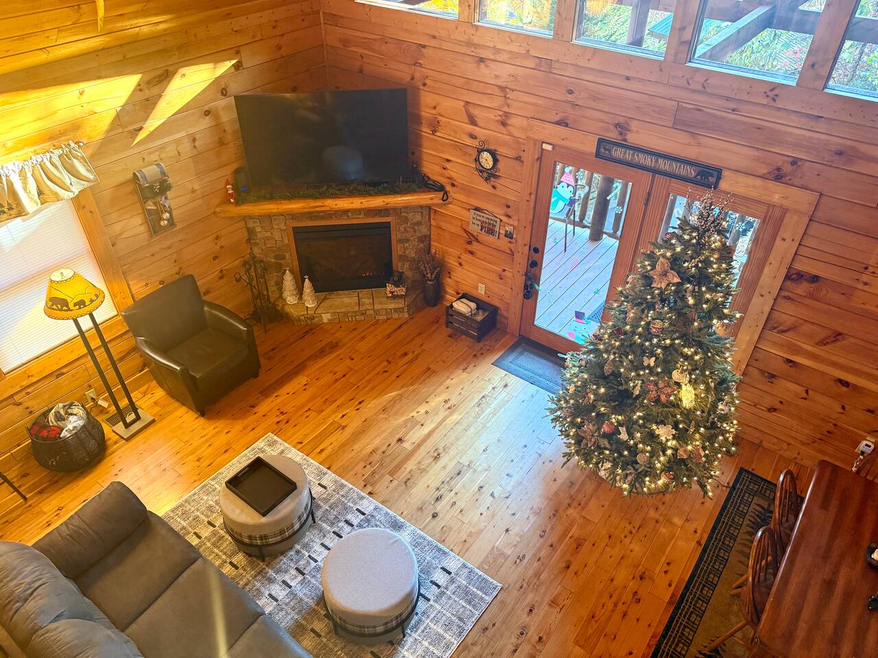 *We will be decorated for the Christmas holiday season during the first week of November to mid-January, adding a festive touch to your stay!* ** CABIN HIGHLIGHTS ** • King en suite • Queen en suite • 2 rocking chairs on the covered balcony surrounded by Tennessee's native trees with a mountain view • Hot tub • 60-inch smart TV with cable in the living room • Sleeper queen sofa • Electric fireplace • Cable and fast Wi-Fi • 42-inch flat screen TVs in both bedrooms with cable • Fully stocked kitchen • Dining table for 6 • Contactless self-check in with smart lock • Free parking on driveway • Seasonally available outdoor community pool typically open from Memorial Day to Labor Day • Charcoal grill • Conveniently located within a short drive to nearby downtown Gatlinburg, Pigeon Forge, Dollywood, and the Great Smoky Mountains National Park FREE STARTER KIT: • Coffee k-cups & pre-filled coffee filters, creamer, & sugar provided • Paper towels • Toilet paper • Shampoo/conditioner • Hand soap • Dish soap • Dishwasher pods • Laundry detergent • Trash bags QUEEN EN SUITE - ENTRY LEVEL • Queen-sized bed • Full private bathroom with tub/shower combo • Flat screen TV with cable • Closet with hangers, fan, heater, iron, and extra pillows • Ceiling fan • A travel crib with original mattress (stored under the bed in the downstairs bedroom). Please bring your own bedding and sheets if you choose to use travel crib • High chair (stored in closet in downstairs bedroom). KING EN SUITE - SECOND FLOOR • King-sized bed • Full private bathroom with shower • Flat screen TV with cable • Closet with hangers, ironing board, with extra blankets • Ceiling fan LIVING ROOM/KITCHEN & DINING AREA • Cathedral ceilings • Dining table with seating for 6 • Cozy leather sleeper sofa (queen-sized, linens provided) • Smart TV with cable & streaming services –– please bring your logins • Electric fireplace • Fully stocked kitchen (dishes, glasses, utensils) • Duo Keurig coffee machine • Toaster, handheld mixer, blender, water kettle, pots/pans • Full sized fridge with freezer • Above-stove microwave • Dishwasher • Washer/dryer combo OUTDOOR SPACES • Covered balcony • Surrounded by trees with a mountain view • Hot tub • 2 rocking chairs • Bistro table for 2 • Charcoal grill –– bring your own charcoal Black Bear Falls Resort offers access to a community pool seasonally with a pool pass, typically open from Memorial Day to Labor Day, depending on the weather and resort management's discretion. The pool is just a short drive away, with parking available in front of the pool area. **BOARD GAMES** • Jenga • Monopoly • Bananagrams • Uno • Trivial Pursuit • Connect 4
