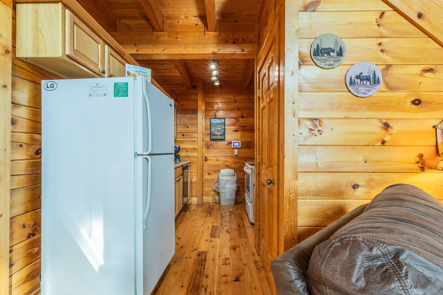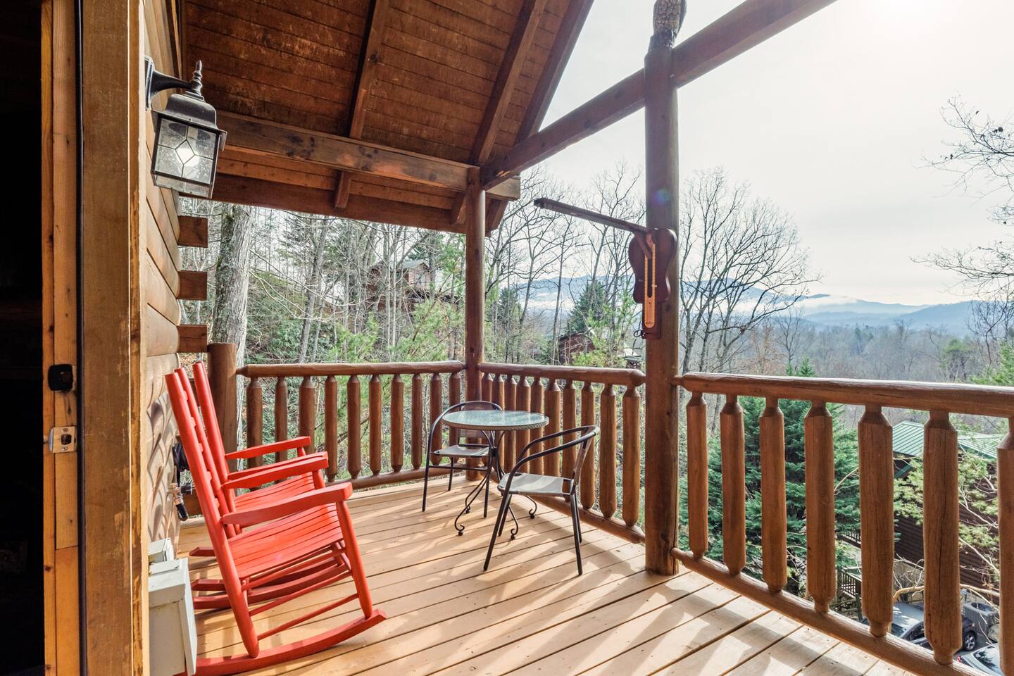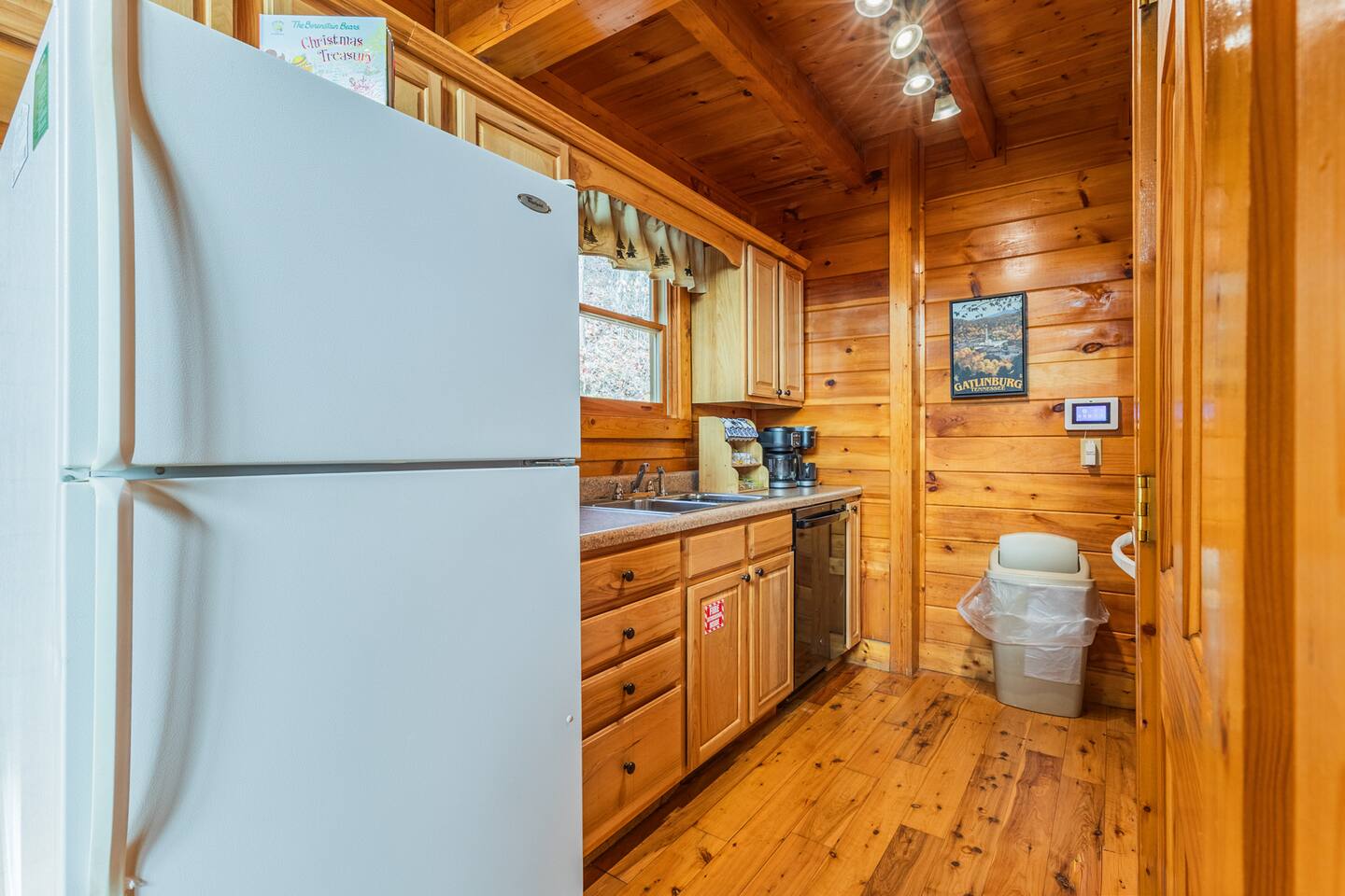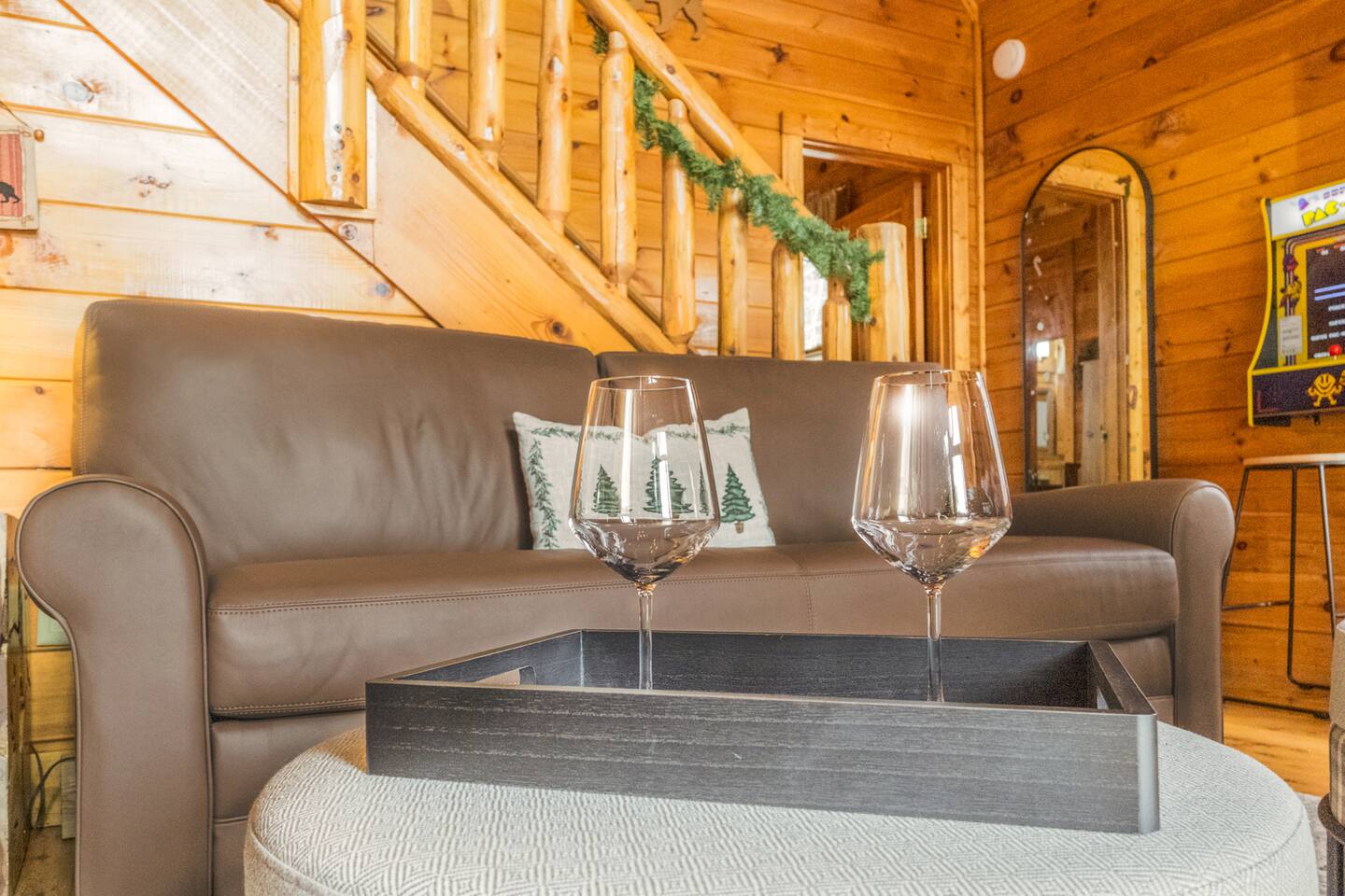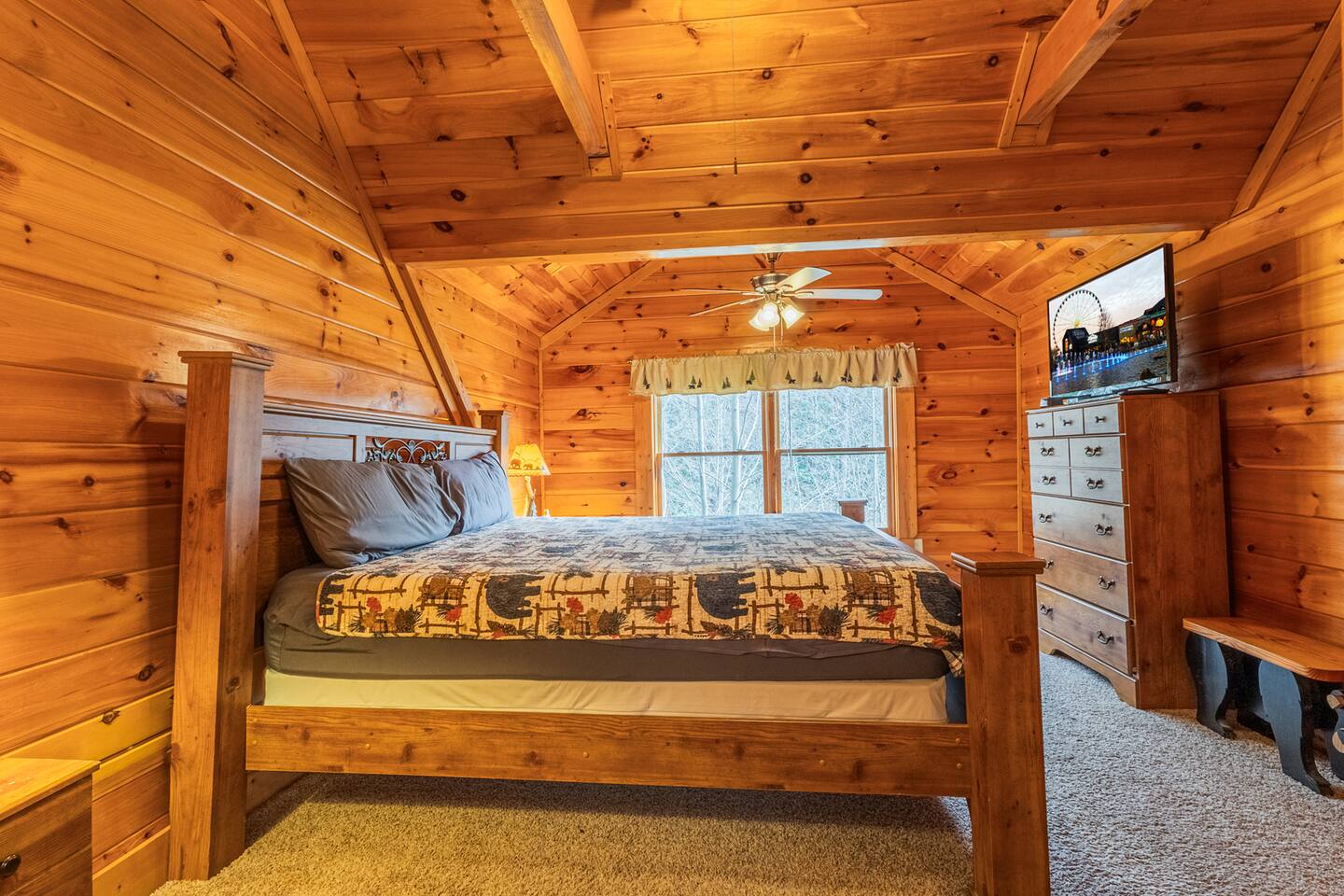 *We will be decorated for the Christmas holiday season during the first week of November to mid-January, adding a festive touch to your stay!* ** CABIN HIGHLIGHTS ** • King en suite • Queen en suite • 2 rocking chairs on the covered balcony surrounded by Tennessee's native trees with a mountain view • Hot tub • 60-inch smart TV with cable in the living room • Sleeper queen sofa • Electric fireplace • Cable and fast Wi-Fi • 42-inch flat screen TVs in both bedrooms with cable • Fully stocked kitchen • Dining table for 6 • Contactless self-check in with smart lock • Free parking on driveway • Seasonally available outdoor community pool typically open from Memorial Day to Labor Day • Charcoal grill • Conveniently located within a short drive to nearby downtown Gatlinburg, Pigeon Forge, Dollywood, and the Great Smoky Mountains National Park FREE STARTER KIT: • Coffee k-cups & pre-filled coffee filters, creamer, & sugar provided • Paper towels • Toilet paper • Shampoo/conditioner • Hand soap • Dish soap • Dishwasher pods • Laundry detergent • Trash bags QUEEN EN SUITE - ENTRY LEVEL • Queen-sized bed • Full private bathroom with tub/shower combo • Flat screen TV with cable • Closet with hangers, fan, heater, iron, and extra pillows • Ceiling fan • A travel crib with original mattress (stored under the bed in the downstairs bedroom). Please bring your own bedding and sheets if you choose to use travel crib • High chair (stored in closet in downstairs bedroom). KING EN SUITE - SECOND FLOOR • King-sized bed • Full private bathroom with shower • Flat screen TV with cable • Closet with hangers, ironing board, with extra blankets • Ceiling fan LIVING ROOM/KITCHEN & DINING AREA • Cathedral ceilings • Dining table with seating for 6 • Cozy leather sleeper sofa (queen-sized, linens provided) • Smart TV with cable & streaming services –– please bring your logins • Electric fireplace • Fully stocked kitchen (dishes, glasses, utensils) • Duo Keurig coffee machine • Toaster, handheld mixer, blender, water kettle, pots/pans • Full sized fridge with freezer • Above-stove microwave • Dishwasher • Washer/dryer combo OUTDOOR SPACES • Covered balcony • Surrounded by trees with a mountain view • Hot tub • 2 rocking chairs • Bistro table for 2 • Charcoal grill –– bring your own charcoal Black Bear Falls Resort offers access to a community pool seasonally with a pool pass, typically open from Memorial Day to Labor Day, depending on the weather and resort management's discretion. The pool is just a short drive away, with parking available in front of the pool area. **BOARD GAMES** • Jenga • Monopoly • Bananagrams • Uno • Trivial Pursuit • Connect 4