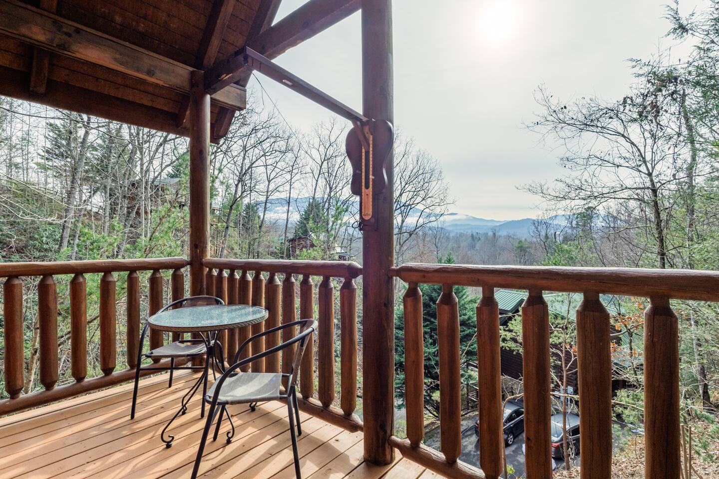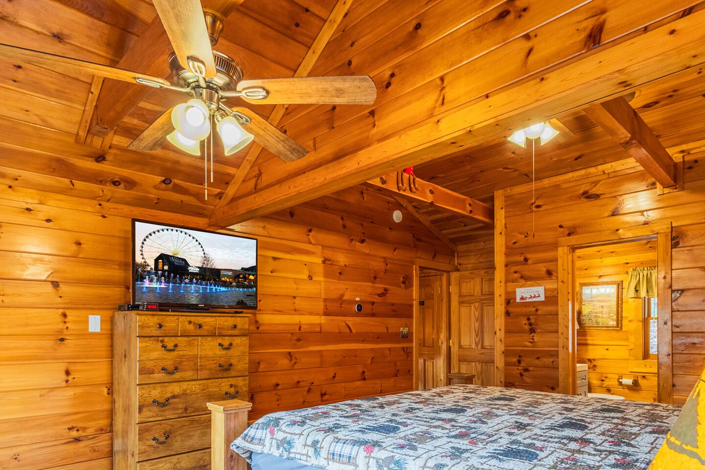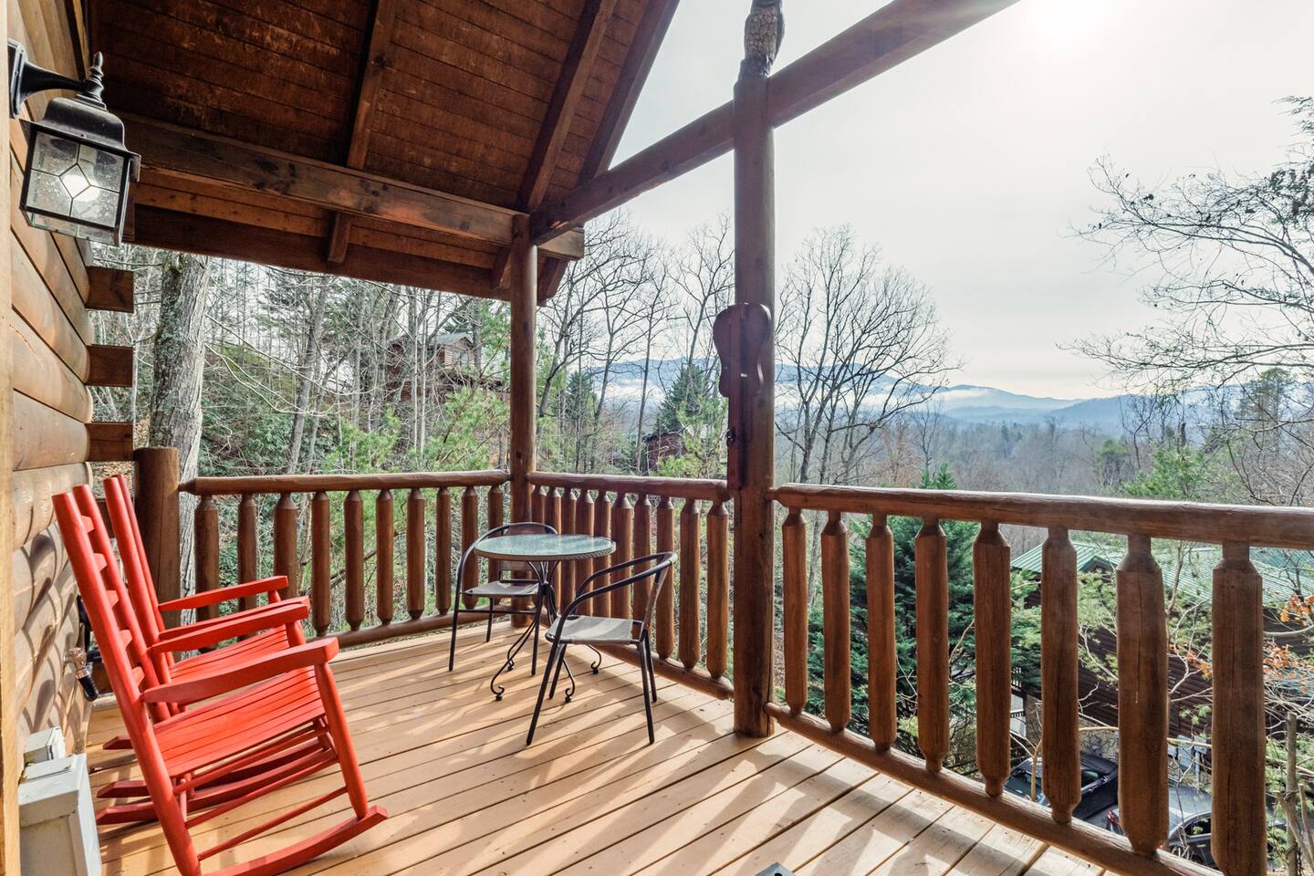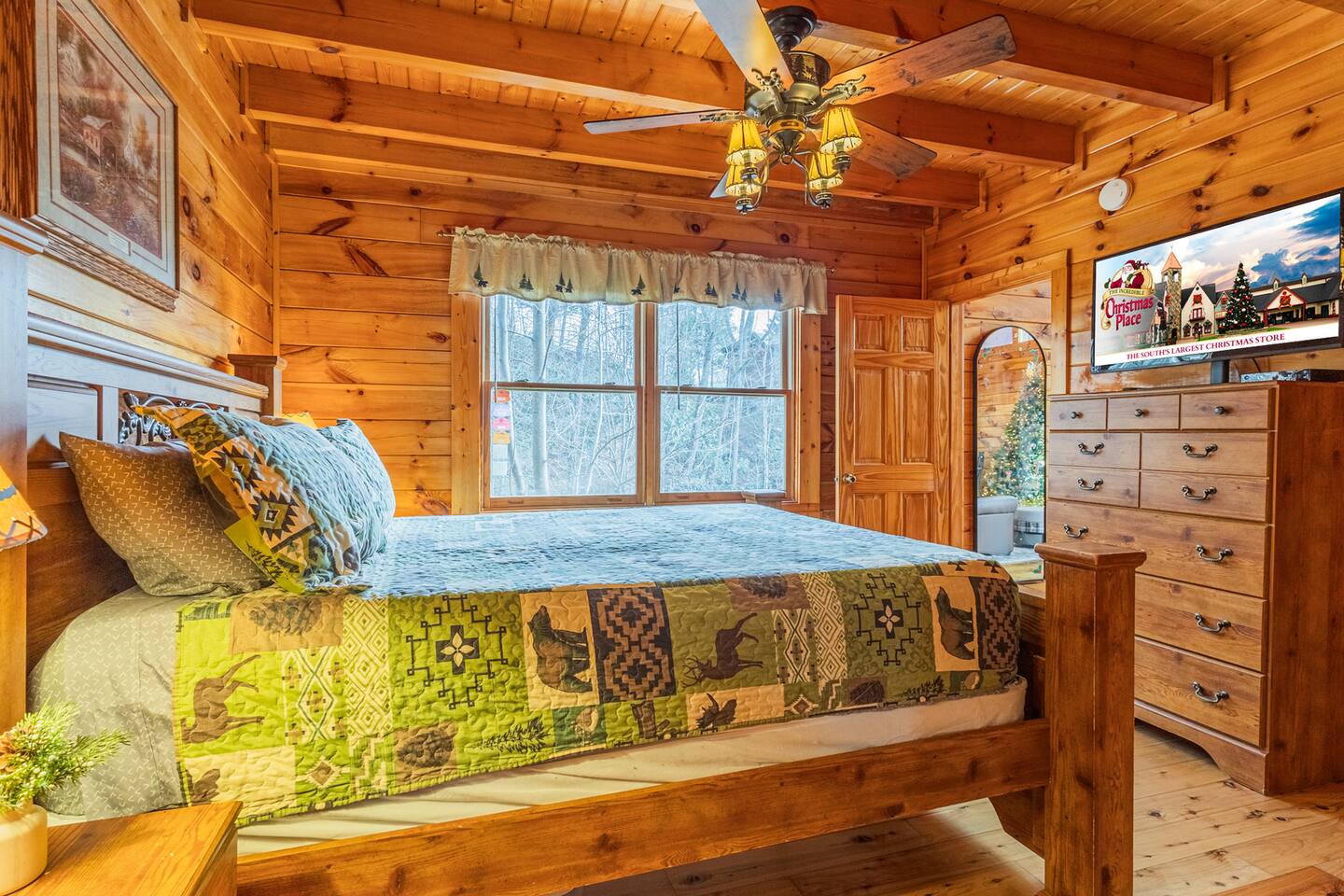 *We will be decorated for the Christmas holiday season during the first week of November to mid-January, adding a festive touch to your stay!* ** CABIN HIGHLIGHTS ** • King en suite • Queen en suite • 2 rocking chairs on the covered balcony surrounded by Tennessee's native trees with a mountain view • Hot tub • 60-inch smart TV with cable in the living room • Sleeper queen sofa • Electric fireplace • Cable and fast Wi-Fi • 42-inch flat screen TVs in both bedrooms with cable • Fully stocked kitchen • Dining table for 6 • Contactless self-check in with smart lock • Free parking on driveway • Seasonally available outdoor community pool typically open from Memorial Day to Labor Day • Charcoal grill • Conveniently located within a short drive to nearby downtown Gatlinburg, Pigeon Forge, Dollywood, and the Great Smoky Mountains National Park FREE STARTER KIT: • Coffee k-cups & pre-filled coffee filters, creamer, & sugar provided • Paper towels • Toilet paper • Shampoo/conditioner • Hand soap • Dish soap • Dishwasher pods • Laundry detergent • Trash bags QUEEN EN SUITE - ENTRY LEVEL • Queen-sized bed • Full private bathroom with tub/shower combo • Flat screen TV with cable • Closet with hangers, fan, heater, iron, and extra pillows • Ceiling fan • A travel crib with original mattress (stored under the bed in the downstairs bedroom). Please bring your own bedding and sheets if you choose to use travel crib • High chair (stored in closet in downstairs bedroom). KING EN SUITE - SECOND FLOOR • King-sized bed • Full private bathroom with shower • Flat screen TV with cable • Closet with hangers, ironing board, with extra blankets • Ceiling fan LIVING ROOM/KITCHEN & DINING AREA • Cathedral ceilings • Dining table with seating for 6 • Cozy leather sleeper sofa (queen-sized, linens provided) • Smart TV with cable & streaming services –– please bring your logins • Electric fireplace • Fully stocked kitchen (dishes, glasses, utensils) • Duo Keurig coffee machine • Toaster, handheld mixer, blender, water kettle, pots/pans • Full sized fridge with freezer • Above-stove microwave • Dishwasher • Washer/dryer combo OUTDOOR SPACES • Covered balcony • Surrounded by trees with a mountain view • Hot tub • 2 rocking chairs • Bistro table for 2 • Charcoal grill –– bring your own charcoal Black Bear Falls Resort offers access to a community pool seasonally with a pool pass, typically open from Memorial Day to Labor Day, depending on the weather and resort management's discretion. The pool is just a short drive away, with parking available in front of the pool area. **BOARD GAMES** • Jenga • Monopoly • Bananagrams • Uno • Trivial Pursuit • Connect 4