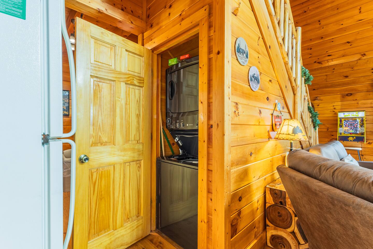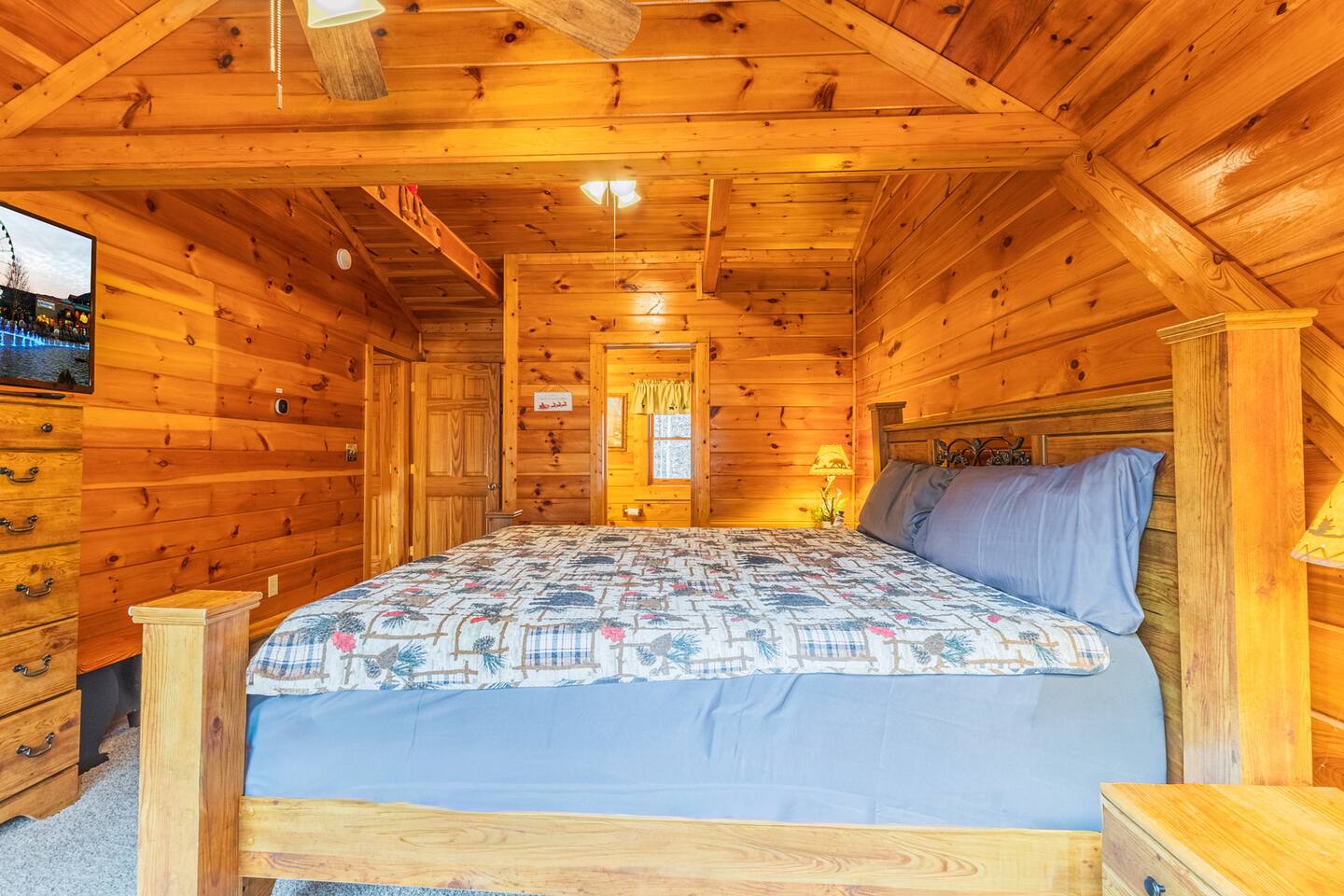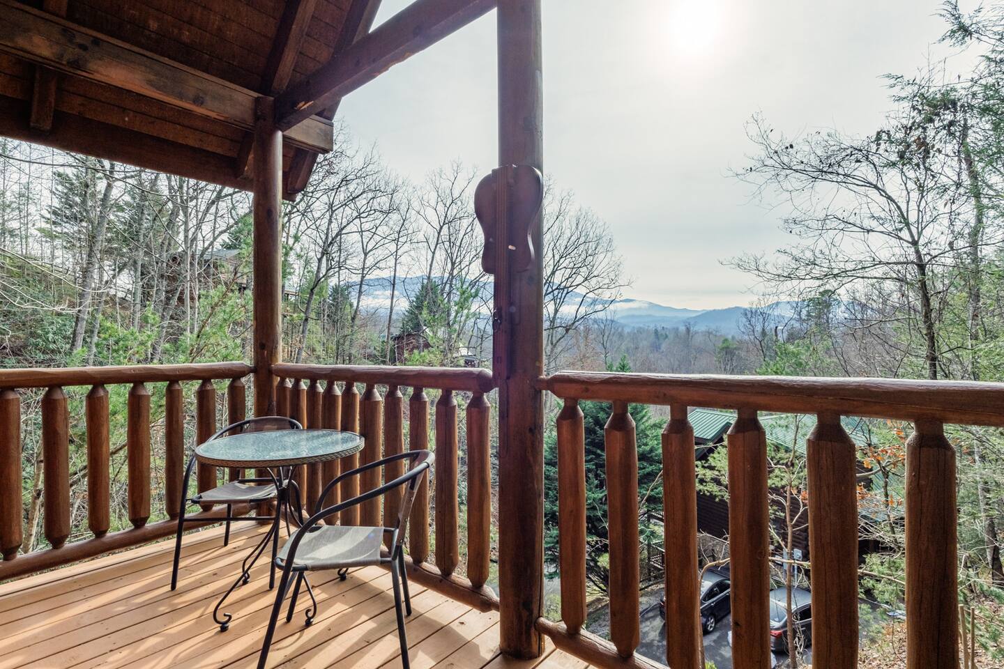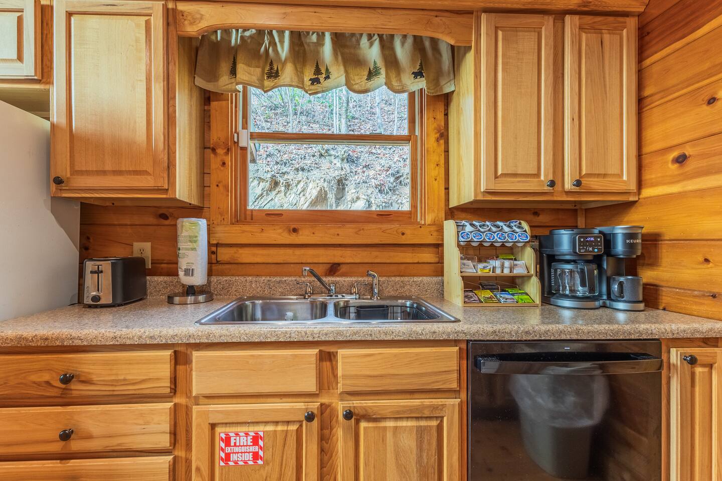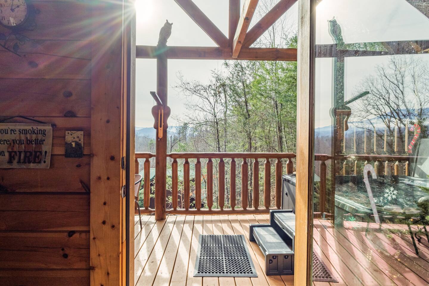 *We will be decorated for the Christmas holiday season during the first week of November to mid-January, adding a festive touch to your stay!* ** CABIN HIGHLIGHTS ** • King en suite • Queen en suite • 2 rocking chairs on the covered balcony surrounded by Tennessee's native trees with a mountain view • Hot tub • 60-inch smart TV with cable in the living room • Sleeper queen sofa • Electric fireplace • Cable and fast Wi-Fi • 42-inch flat screen TVs in both bedrooms with cable • Fully stocked kitchen • Dining table for 6 • Contactless self-check in with smart lock • Free parking on driveway • Seasonally available outdoor community pool typically open from Memorial Day to Labor Day • Charcoal grill • Conveniently located within a short drive to nearby downtown Gatlinburg, Pigeon Forge, Dollywood, and the Great Smoky Mountains National Park FREE STARTER KIT: • Coffee k-cups & pre-filled coffee filters, creamer, & sugar provided • Paper towels • Toilet paper • Shampoo/conditioner • Hand soap • Dish soap • Dishwasher pods • Laundry detergent • Trash bags QUEEN EN SUITE - ENTRY LEVEL • Queen-sized bed • Full private bathroom with tub/shower combo • Flat screen TV with cable • Closet with hangers, fan, heater, iron, and extra pillows • Ceiling fan • A travel crib with original mattress (stored under the bed in the downstairs bedroom). Please bring your own bedding and sheets if you choose to use travel crib • High chair (stored in closet in downstairs bedroom). KING EN SUITE - SECOND FLOOR • King-sized bed • Full private bathroom with shower • Flat screen TV with cable • Closet with hangers, ironing board, with extra blankets • Ceiling fan LIVING ROOM/KITCHEN & DINING AREA • Cathedral ceilings • Dining table with seating for 6 • Cozy leather sleeper sofa (queen-sized, linens provided) • Smart TV with cable & streaming services –– please bring your logins • Electric fireplace • Fully stocked kitchen (dishes, glasses, utensils) • Duo Keurig coffee machine • Toaster, handheld mixer, blender, water kettle, pots/pans • Full sized fridge with freezer • Above-stove microwave • Dishwasher • Washer/dryer combo OUTDOOR SPACES • Covered balcony • Surrounded by trees with a mountain view • Hot tub • 2 rocking chairs • Bistro table for 2 • Charcoal grill –– bring your own charcoal Black Bear Falls Resort offers access to a community pool seasonally with a pool pass, typically open from Memorial Day to Labor Day, depending on the weather and resort management's discretion. The pool is just a short drive away, with parking available in front of the pool area. **BOARD GAMES** • Jenga • Monopoly • Bananagrams • Uno • Trivial Pursuit • Connect 4